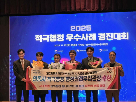 안동시 관계자는 “이번 수상은 에너지 기술 혁신과 적극행정이 결합된 성과로, 발전수익을 주민에게 적기에 환원할 수 있는 기반을 마련했다”며 “앞으로도 시민 편의를 높이고 지역발전에 기여하는 적극행정을 지속해 나가겠다”고 말했다.