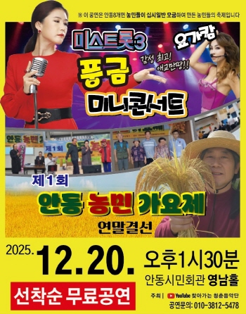 찾아가는 청춘음악단 관계자는 “농민의 삶과 애환, 그리고 희망을 노래로 나누는 뜻깊은 무대를 만들기 위해 많은 분이 후원을 해주셨다”며 “전석 무료로 진행하는 만큼, 시민과 관광객 여러분의 많은 관심과 참여를 바란다”고 전했다. 이어 “이번 축제가 겨울을 맞은 안동에 따뜻한 온기를 전하고, 농민들이 함께 웃는 특별한 시간이 되길 바란다”고 덧붙였다.