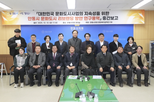 안동시의회 문화복지정책연구회(회장 우창하)는 12월 12일 안동시의회 회의실에서 「대한민국 문화도시사업 지속성을 위한 안동시 문화도시 리브랜딩 방안 연구」 정책연구용역 중간보고회를 개최하고, 안동 문화도시 정책의 중장기 방향과 지속 전략을 점검했다.