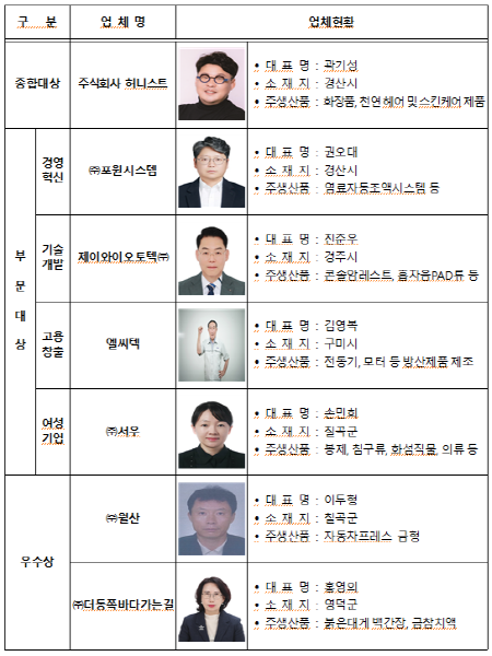 종합대상에는 주식회사 허니스트(경산시), 경영혁신 부문 대상에는 ㈜포원시스템(경산시), 기술개발 부문 대상에는 제이와이오토텍㈜(경주시), 고용창출 부문 대상에는 엘씨텍(구미시), 여성기업 부문 대상에는 ㈜서우(칠곡군), 우수상에는 ㈜월산(칠곡군), ㈜더동쪽바다가는길(영덕군)이 받았다.