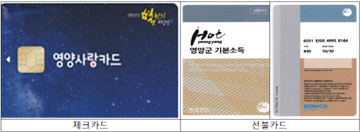 아울러, 미성년자, IT 취약계층, 2G 폰 이용자 및 본인명의 휴대전화가 없는 경우 등은 체크카드 발행이 제한 되며 영양군에서 별도 발급하는 선불카드 방식으로 기본소득 지급 될 예정이다.