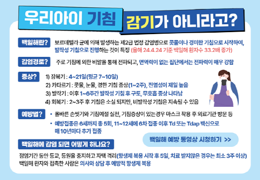 백일해는 신생아 감염 시 치명률이 약 4%에 달하는 위험한 호흡기 감염병으로, 임신 27~36주 사이 임신부에게 백일해 예방접종을 권장하고 있다. 이 시기에 접종할 경우 임신부뿐만 아니라 신생아와 영아의 감염 위험을 효과적으로 낮출 수 있는 것으로 알려져 있다.