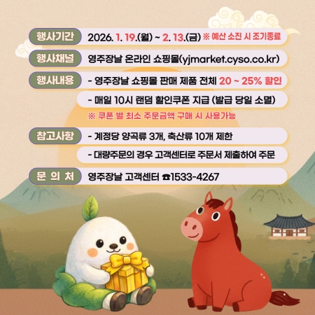 영주시는 설 명절을 앞두고 공식 온라인 쇼핑몰 ‘영주장날’을 통해 지역 농·특산물을 합리적인 가격에 구매할 수 있는 대규모 할인 행사를 진행한다.