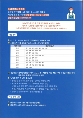 이번 사업은 농작업안전관리자가 농업경영주를 직접 방문해, 농작업 현장의 위험요인을 진단하고 농가 여건에 맞는 맞춤형 안전관리 컨설팅을 제공하는 사업이다. 2월까지 상시 모집을 통해 총 110농가를 선정할 계획이며, 컨설팅은 3월부터 11월까지 진행된다. 참여 비용은 전액 무료로 지원된다.