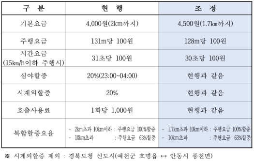 이번 요금 조정에 따라 기본요금 적용 거리는 2㎞에서 1.7㎞로 변경되며, 거리 요금은 131m당 100원에서 128m당 100원으로, 시간 요금은 시속 15㎞ 이하 주행 시 31초당 100원에서 30초당 100원으로 각각 조정된다. 복합할증과 시계외할증 요율은 현행과 동일하게 유지된다.