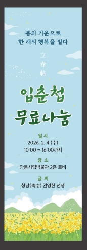 안동시립박물관은 2026 병오년 입춘을 맞아, 박물관을 찾는 관람객들을 대상으로 ‘입춘첩(立春帖)’ 무료 나눔 행사를 2월 4일(수) 오전 10시부터 오후 4시까지 진행한다.