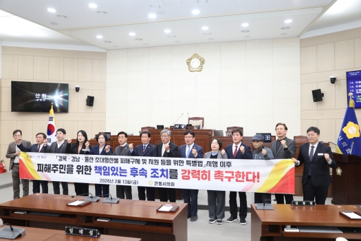 이어 안동시산불피해대책특별위원회에서 제안한 ▲안동시산불피해대책특별위원회 결과보고서와 ▲「경북ㆍ경남ㆍ울산 초대형산불 피해구제 및 지원 등을 위한 특별법」시행 이후 실질적 이행과 보완을 요구하는 대정부 촉구 건의안, 2건을 차례로 의결하며 산불피해지역 주민들을 위한 정부의 책임 있는 후속조치를 즉각 이행할 것을 촉구했다.