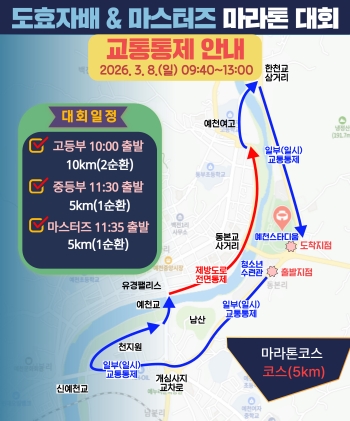 예천군(군수 김학동)은 오는 8일 오전 10시부터 예천읍 일원에서「제12회 예천 도효자배 전국 중·고 단축마라톤대회」및「2026 예천군민 마스터즈 단축마라톤대회」를 개최한다.