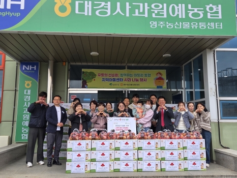 영주시는 9일 영주농산물유통센터에서 지역사회 공헌 활동의 일환으로 지역아동센터 대상 사과 기부 전달식을 개최했다.