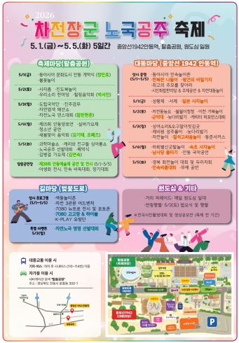 또한 읍면동 시민화합한마당, 거리 퍼레이드, 풍물한마당, 차전노국 댄스대회, 노국공주 선발대회 등 시민 참여 프로그램이 확대돼 공동체가 함께 어우러지는 축제의 의미를 더하고, 길마당에서는 차전 3관문 어드벤처와 색동놀이존 등 체험형 콘텐츠가 운영돼 방문객들이 축제장 곳곳에서 안동의 전통을 직접 오감으로 즐길 수 있도록 만든다.