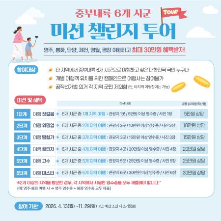 이번 사업은 경상북도·충청북도·강원도 접경 지역 6개 지자체가 공동 추진하는 관광 마케팅 프로그램으로, 여행객이 각 지역 명소를 방문하고 미션을 수행하면 지역 특산물을 경품으로 제공하는 참여형 이벤트다.