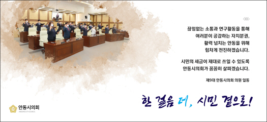 모쪼록 안동시의회에서 시작된 선한 영향력이 지역을 넘어 경북도 각기관, 단체에 이르기 까지 소수의 의견 등을 소흘히 하지 않고 서로 존중하고 배려하고 화합하는 분위기가 이어지기를 기대해 본다.