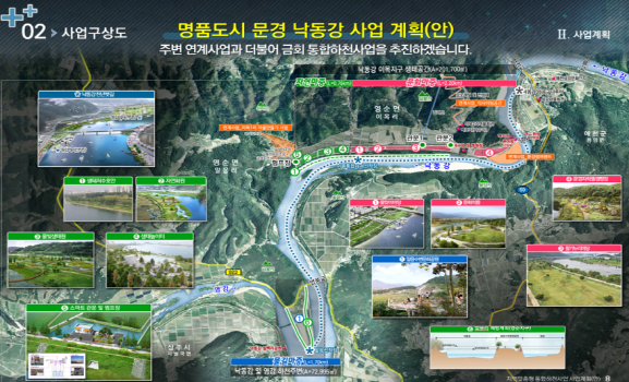 또 문경시의 「낙동강 지역맞춤형 통합하천사업」은 문경 영순 이목리 일원의 뱃길 복원을 통한 하천의 역사·문화 체험 등 관광자원 확보, 낙동강에서 수상레저, 스포츠 공간 마련과 이벤트 등을 통해 다양한 공적 수변문화 공간으로 확대하는 사업으로 예상 사업비 504억원 정도를 투입할 예정이다.