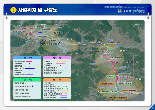 사업내용으로는 경주율동~포항송도의 34km 구간에 4942억원 정도로 주민 생활수준이 향상되면서 하천을 여가와 휴식 공간으로 적극 활용하려는 지역 주민의 요구에 맞는 사업을 추진할 계획이다.