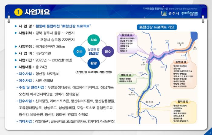 선정된 사업과 관련해 포항·경주시는 그간 국가하천 형산강 친수사업을 별도로 추진해오던 기존 사업을 「환동해통합하천 신형산강 프로젝트」로 한데 묶어 공동으로 시행한다.