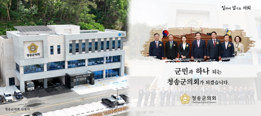 더불어 지난 7월 출범한 제9대 청송군의회는 경기침체의 위기 극복을 넘어 새로운 희망을 만들어가고자 군민 여러분과 함께 힘차게 달려왔습니다. 따뜻한 격려와 성원을 보내주신 군민 여러분 덕분에 ‘일하며 섬기는 청송군의회’라는 의정 목표 아래 군민의 다양한 목소리에 귀 기울이며 활발한 의정활동을 펼치고 있습니다.