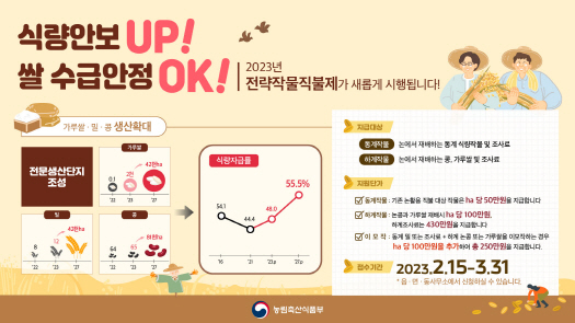 전략작물직불제는 논활용직불제(논이모작)를 확대 개편한 것으로 논에 벼 대신 수입 의존도가 높은 밀, 콩, 가루쌀 등을 재배하는 농업인, 농업법인에 추가로 제공하는 선택형직불금이다.