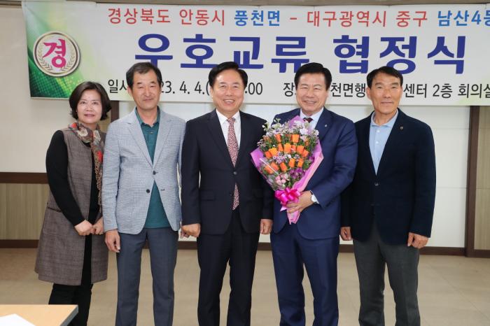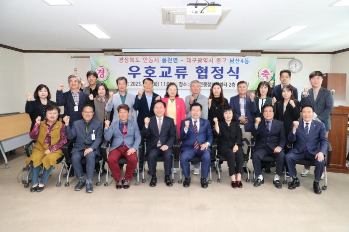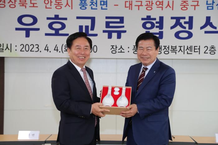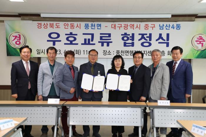 안동시 풍천면(면장 오규태)과 대구광역시 중구 남산4동(동장 권미진)은 지난 4일 지속가능한 동반성장과 우호증진을 위한 우호교류 협정을 체결했다.