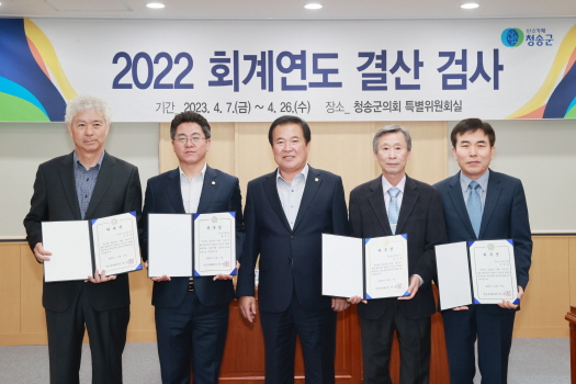결산 검사는 4월 7일부터 4월 26일까지 20일간 진행되며, 결산검사에서 위원들은 지난해 청송군에서 작성한 2022회계연도 결산서를 검사한다. 주요 내용은 세입·세출 예산과 기금, 채권, 채무, 공유재산, 물품 등 결산 전 분야에 걸쳐 예산집행 건전성, 적정성, 효율성 등을 중점적으로 살펴 청송군 재정 운영 전반에 대해 종합적으로 검사한 후 결산검사 의견서를 작성하여 청송군수에게 제출하게 된다.