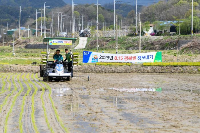 영주시는 20일 안정면 오계리 황순섭 농가의 논에서 ‘2023년 8·15광복쌀 재배단지 첫 모내기 행사’를 개최했다.