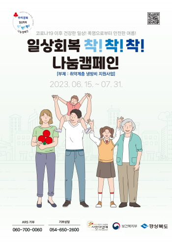 취약계층 냉방비 지원을 위한 「우리 경북, 일상회복 착!착!착! 나눔캠페인*」은 경북사회복지공동모금회(회장 전우헌) 주관으로 6월 15일부터 7월 31일까지 47일간 진행된다.