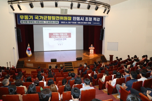 안동시는 20일 안동시청 대동관(낙동홀)에서 우동기 국가균형발전위원장을 초청해 ‘이제는 지방시대 다시 뛰는 대한민국! 그 비전과 전략’을 주제로 특별강연을 개최했다.