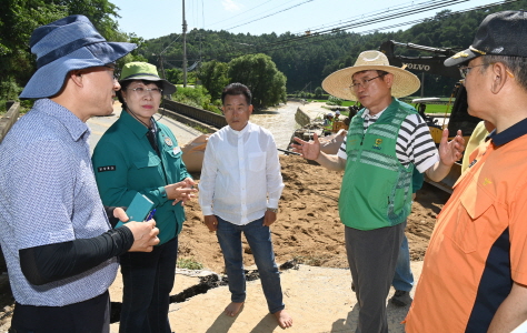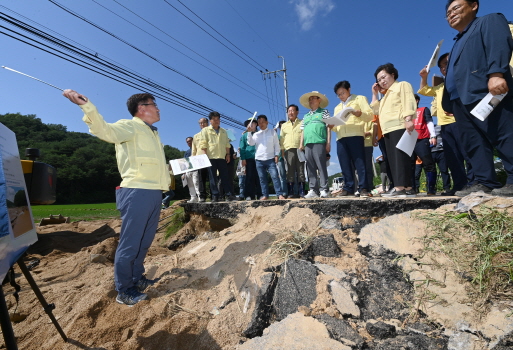 이철우 지사는 봉화군 봉성면 하천제방 유실에 따른 농경지 피해지역을 찾아 주민들에게 위로의 말을 전하며 “피해 주민들이 빠른 시일 내 안정된 생업을 영위할 수 있도록 모든 행정력을 동원하겠다”라고 말했다.