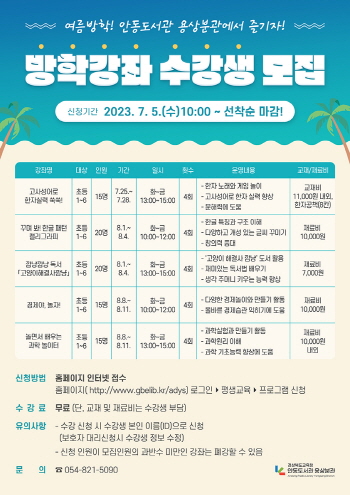 경상북도교육청 안동도서관(관장 권오규) 용상분관에서는 여름방학을 맞아 초등학생을 대상으로, 여름방학특강 5개 프로그램을 7월과 8월에 걸쳐 3주간 운영한다.