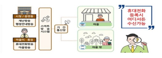 스마트마을방송 시스템은 원격방송(휴대폰, PC사용)을 통해 마을 옥외 스피커 방송뿐만 아니라, 주민의 휴대전화 또는 유선전화로 방송을 청취할 수 있는 시스템으로 현재 도내 10개 시군에 구축되어 있다.