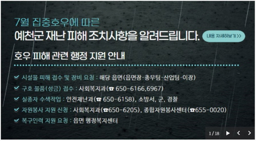 경북에서 가장 큰 피해지역인 예천군은 ‘특별재난지역’으로 선포됐으며, 수해를 당한 주민은 직접 이달 31일까지 읍·면 행정복지센터에 신고해야 각종 보상과 혜택을 받을 수 있다.