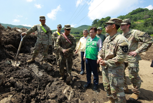이철우 경북도지사는 지난 28일 예천군 은풍면 백석리 일대에 집중호우 피해를 조기 복구하고자 투입된 미8군 예하 미2사단/한미연합사단 11공병대대 장병들을 격려하기 위해 문병삼 50사단장, 김학동 예천군수 등과 함께 복구 현장을 찾았다.