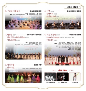 청송문화원이 주최하고 청송군, 청송군의회가 후원하는 이번 행사는 청송문화예술인 및 초대가수의 공연으로 꾸며진다. 먼저 청송문화원풍물단의 사물놀이를 시작으로 청송 라온색소폰앙상블, 민요팀 가향, 청송 아코디언동호회, 청송문화원 합창단 등이 연말 따뜻한 송년음악을 전한다.