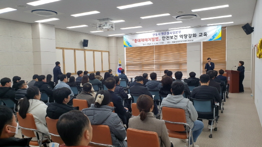 안동시 맑은물사업본부(본부장 김도선)는 2024년 2월 7일(수) 14시 명륜동행정복지센터 회의실에서 본부 소속 전직원과 상·하수도 공사 대행업체 관계자 80여 명을 대상으로 중대재해예방 및 안전사고 발생 시 대응능력 향상을 위한 ‘중대재해처벌법 안전보건역량강화 교육’을 실시했다.