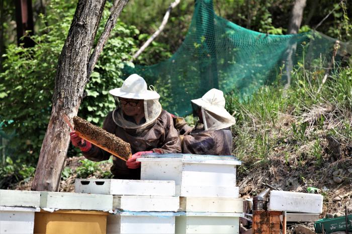 안동시 임하면 (김재규학원 인근) 소재 손도헌(78세) 어르신 부부는 이날 오전 여왕벌이 있는지, 왕대는 달렸는지, 어린벌은 잘자라고 있는지 등 벌통을 살피는 내검 일을 벌여 놓으셨네요.