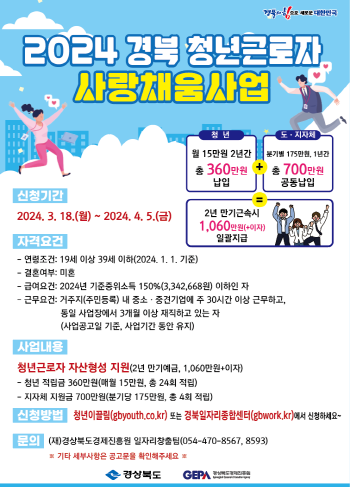 이에 경북도는 이번달 18일부터 4월 5일까지 ‘청년근로자 사랑채움사업’ 신청자를 모집하고 최종 135명을 선정한다.