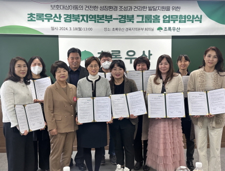 경상북도가 결연 지원하는 초록우산 어린이재단 경북지역본부(본부장 박정숙)와 도내 8개 그룹홈(경북그룹홈지부장 최미혜)은 18일 초록우산 어린이재단 경북지역본부에서 보호대상 아동들의 건전한 성장환경 조성을 위한 업무협약을 체결했다.