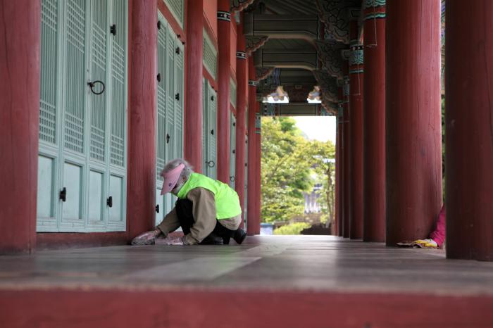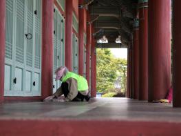 6일 오전 안동시 웅부공원 툇마루 청소에 열중하고 계시는 참여자 모습을 지켜 보았습니다.
