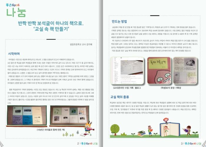 「좋은 Gyo6 나눔」은 현장 교사들이 듣고 싶은 수업 이야기 주제를 월별로 스스로 정하고 이를 올곧게 실천하고 있는 교사들의 수업 이야기를 담았다. 코로나19에 따른 교육과정 재구성 사례, 효과적인 원격수업의 비결, 문해력 향상법 등 미래 교육의 핵심인 학생 중심 수업과 학습자의 차이와 개성을 고려한 수업 실천 사례들로 구성되었다.