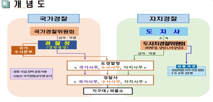 ◦ (지휘‧감독) 국가경찰사무는 경찰청장, 자치경찰사무는 道자치경찰위원회, 수사사무는 국가수사본부장이 道경찰청장을 지휘‧감독