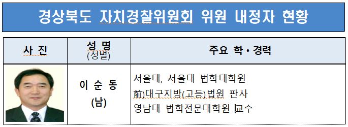 경상북도자치경찰위원회를 이끌어 갈 이순동 위원장 내정자는 제22회 사법시험(사법연수원 12기)에 합격해 대구지방법원・대구고등법원 판사, 대법원 재판연구관 등 13년 동안 법관직을 수행하여 왔으며, 변호사를 거쳐 2010년부터는 영남대학교에서 후학을 양성하고 있다. 이 위원장은 법조계 생활 동안 합리적인 사관을 가진 것으로 평가 받아 왔으며, 법에 대한 풍부한 식견과 경험을 보유해 초대 경상북도자치경찰위원회 위원장으로 적합하다는 평가를 받고 있다.