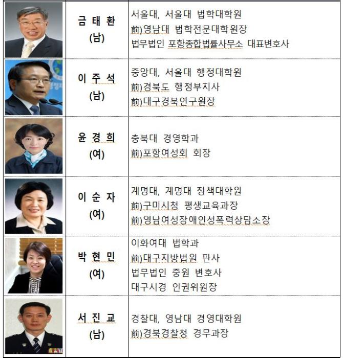 한편, 위원 내정자로 경상북도의회에서 추천한 금태환 위원은 영남대학교에서 법학전문대학원 원장을 역임하면서 지역의 법조인 양성에 앞장섰으며 현재는 변호사로 활동하고 있고, 이주석 위원은 30년 이상 행정안전부와 경상북도에 재직한 행정전문가로 경상북도 행정부지사, 행정안전부 지방재정세제실장, 대구경북연구원장 등을 역임했다.