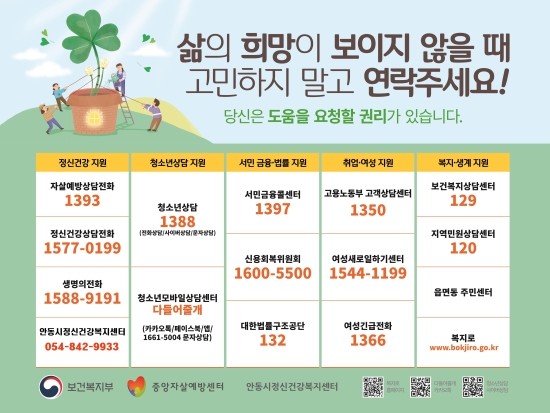 안동시 관계자는 "관내 숙박업소에서 매년 2~3건 정도의 극단적 선택이 발생하는데, 이번 캠페인을 통해 이런 위기에서 벗어나 심리적으로 안정되는데 조금이라도 도움이 되길 기대한다.”라고 말했다.