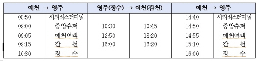 이에 군은 운수업체(예천여객)와 협의를 통해 군민들의 건의 사항을 전격 수렴, 예천-장수면을 운행하는 노선을 신설해 2024년 8월 1일부터 전격 운행한다.