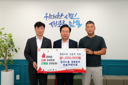 한국노총 경북본부 안동지역지부는 추석을 맞아 소외계층을 위해 안동사랑상품권 100만 원을 기부하며 모두가 풍성한 추석을 보내기를 바라는 소망을 담아 온기를 나눴다.