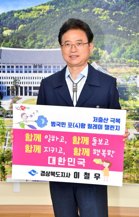 권영진 대구광역시장의 지목을 받아 이번 챌린지에 참여한 이철우 도지사는 “저출산과 고령화로 인구절벽이 가속화되는 지금, 저출산 극복을 위해서는 적절한 정책과 국민의 동참이 필요하다”며 “체감도 높고 실효성 있는 정책추진으로 아이 낳고 키우기 좋은 경북을 만들기 위해 적극적으로 노력하겠다”며 다음 릴레이 주자로 오세훈 서울시장과 임종식 경상북도 교육감을 지목했다