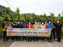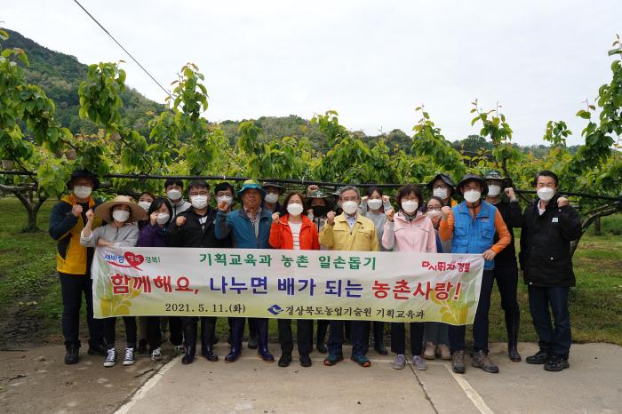 이러한 농가에 조금이나마 도움을 주고자 농촌지원국 3개 과는 5월 11일(기획교육과, 상주), 12일(기술보급과, 영천), 14일(농촌자원과, 성주) 3일의 일정으로 배 적과작업, 마늘종 제거, 포도 곁순따기 등 농가 일손을 도왔다. 아울러 영농현장의 애로사항 및 해결방안에 대해서 의견을 나눴다.