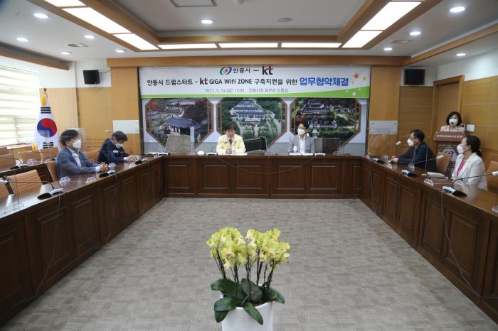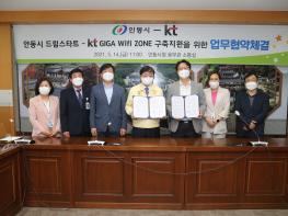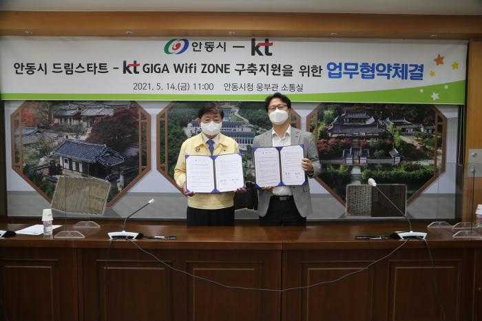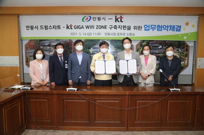 (안동시=경북온뉴스) 김승진 기자 = 안동시는 5월 14일 드림스타트 대상아동들이 가정에서 원활하게 온라인 학습활동에 참여할 수 있도록 KT안동지사와 기가 와이파이존(GiGA Wifi-Zone) 구축 지원을 위한 업무 협약을 체결했다.