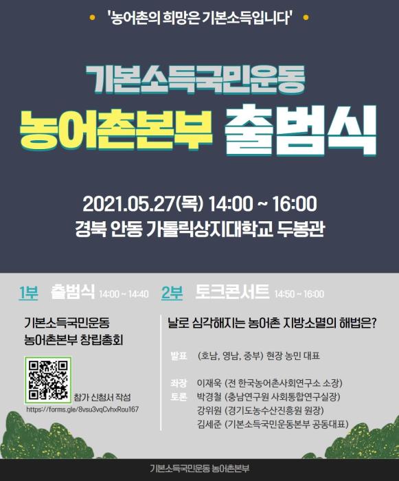 (안동=경북온뉴스) 김승진 기자 = 기본소득국민운동 농어촌본부가 5월 27일 출범식을 가진다.
