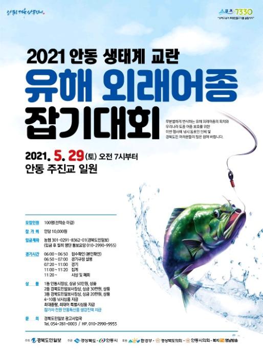 (안동시=경북온뉴스) 김광열 기자 = 안동시는 무분별하게 번식하는 유해 외래어종 퇴치와 전통 토속 어종의 보호를 위해 오는 29일 안동댐 주진교 일대에서 「2021 안동 생태계교란 유해 외래어종 잡기대회」를 개최한다.
