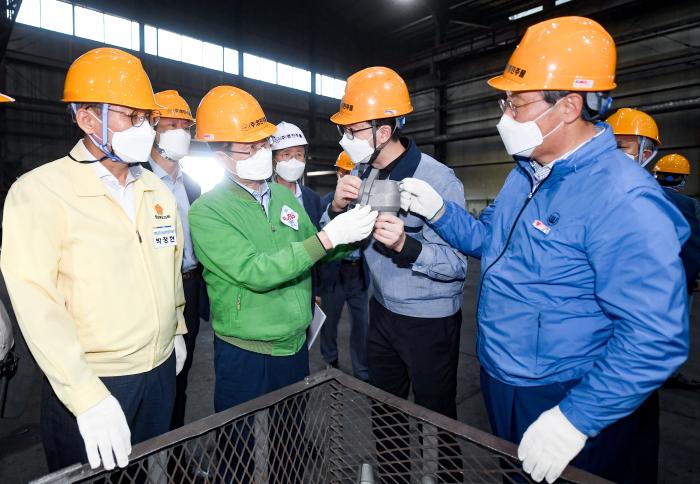 이철우 도지사는 간담회를 마친 후 고령군 다산면의 ㈜영진주물을 방문해 뿌리산업의 대표 제품인 주물 생산공정을 살펴봤다. 현장에서 이 지사는 3D라고 불릴 만큼 힘든 업종임에도 불구하고 꿋꿋이 자리를 지키며 제품 생산에 매진하고 있는 직원들을 일일이 격려하고, 제조업의 근간을 만드는 중요한 작업인 만큼 자긍심을 갖고 최선을 다해 달라고 당부했다.